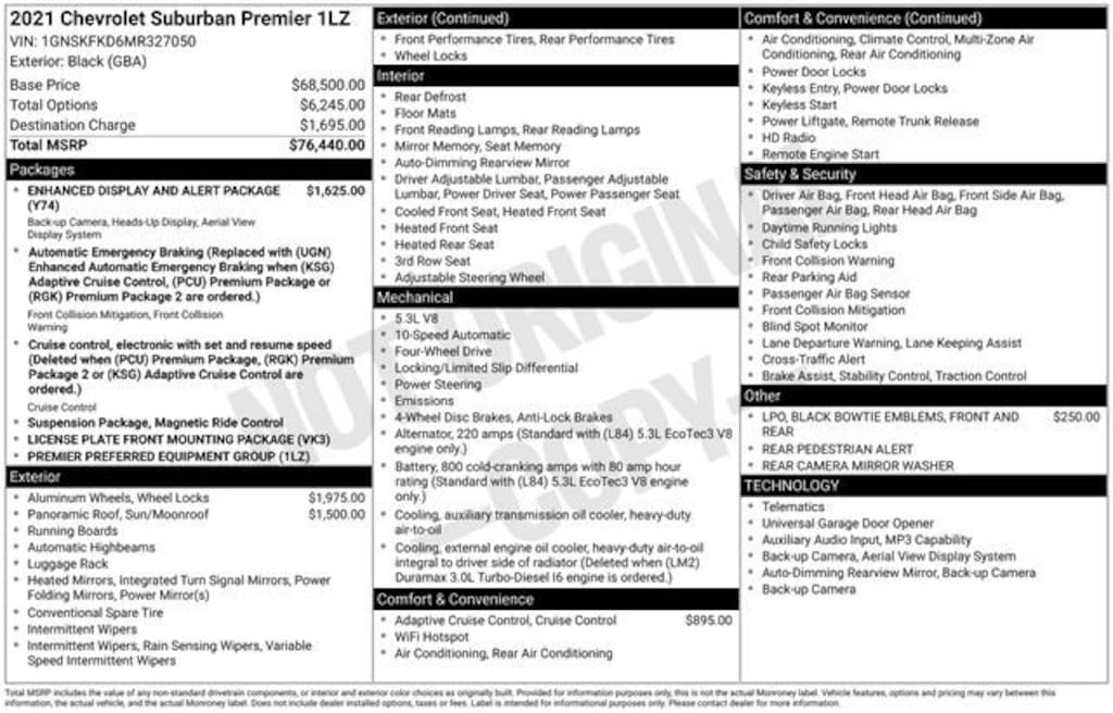 CARFAX One-Owner. Sunroof, Adaptive Cruise Control, HD Surround Vision, Heads Up Display +Apple CarPlay / Android Auto, Autoride Suspension Package, Backup Camera, Bluetooth, Lane Change Alert, Leather Seats, Leather Wrap Steering Wheel, OnStar Remote App., Power Rear Lift Gate, Rear Park Assist, Remote Start, Sunroof/Moonroof, Tow Package, WiFi. Black 2021 Chevrolet Suburban EcoTec3 5.3L V8 15/19 City/Highway MPG